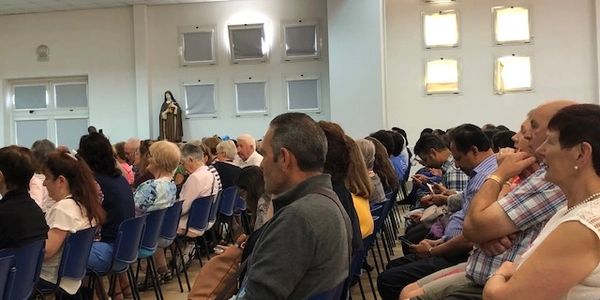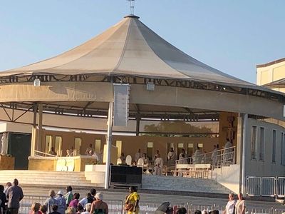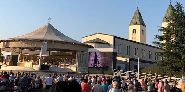 Attending evening mass outside of St. James Church with Rosary and Adoration to Our Lady. Thousands of people attending.